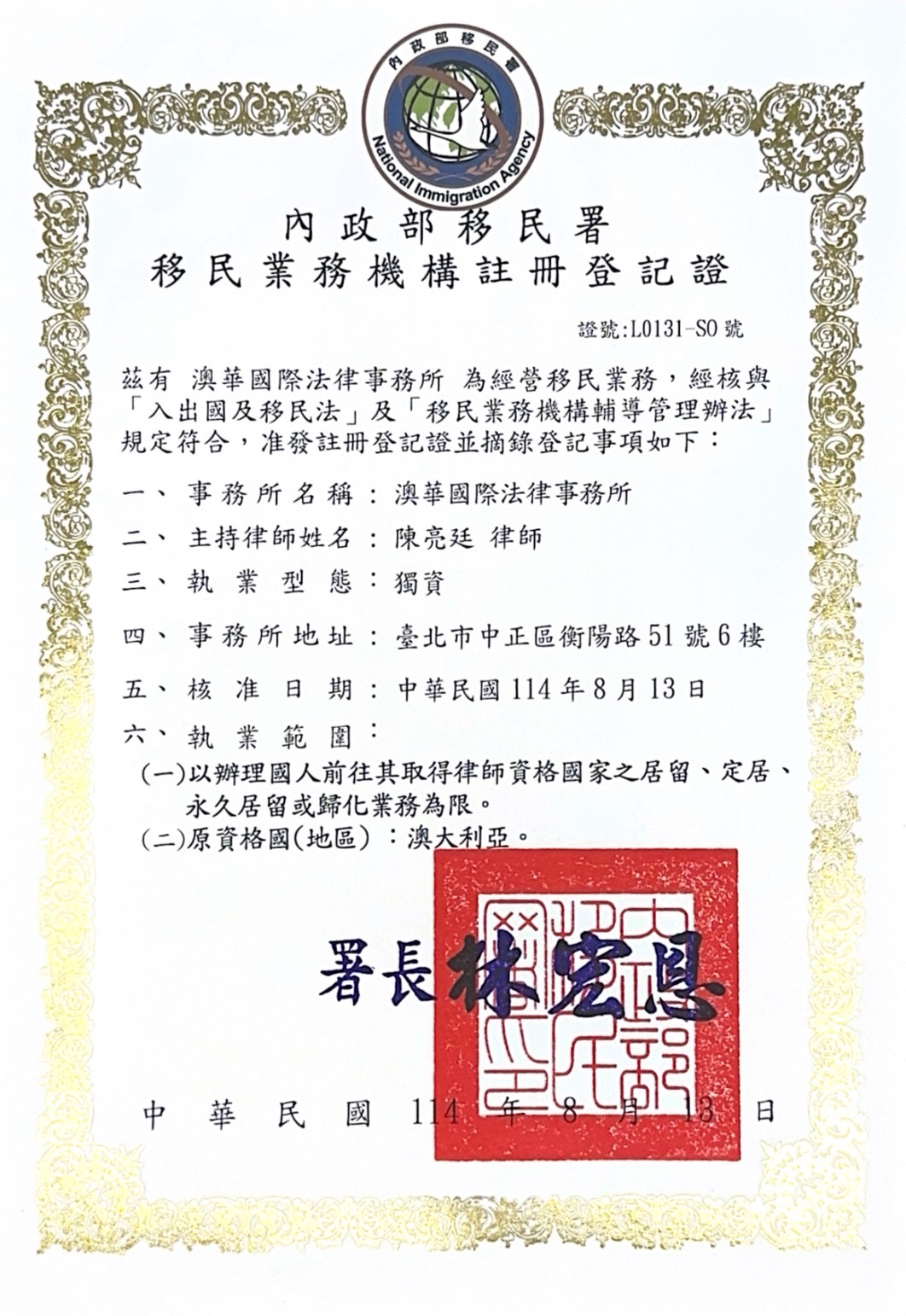 陳會計師於1996年8月成立澳大利亞移民顧問公司(澳洲), 在過去的25年, 為無數來自世界各地的客戶成功辦理移民及各類簽証。因著專業會計師的背景, 更能掌握商業技術及商業投資移民申請所需的相關財務資料而大大增加申請核准的機率。並且在針對移民局處理各類簽證而提起上訴案件中, 秉持客觀專業的態度及移民法例的嫻熟, 常為客戶成功取得勝訴判決。